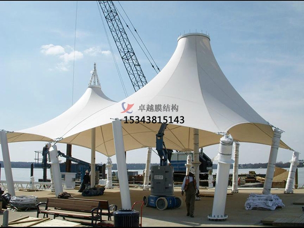 張拉膜結(jié)構(gòu)則通過柱及鋼架支承或鋼索張拉成型。以膜材、鋼索及支柱構(gòu)成,利用鋼索與支柱在膜材中導(dǎo)入張力以達安 定的形式。除了可實踐具創(chuàng)意,創(chuàng)新且美觀的造型外,也是能展現(xiàn)膜結(jié) 構(gòu)精神的構(gòu)造形式. 大型跨距空間也多采用以鋼索與壓縮材構(gòu)成鋼索網(wǎng)來支撐上部膜材的形式。因施工精度要求]高,結(jié)構(gòu)性能強,且具豐富的表現(xiàn)力,所以造價略高于骨架式膜結(jié)構(gòu)。
