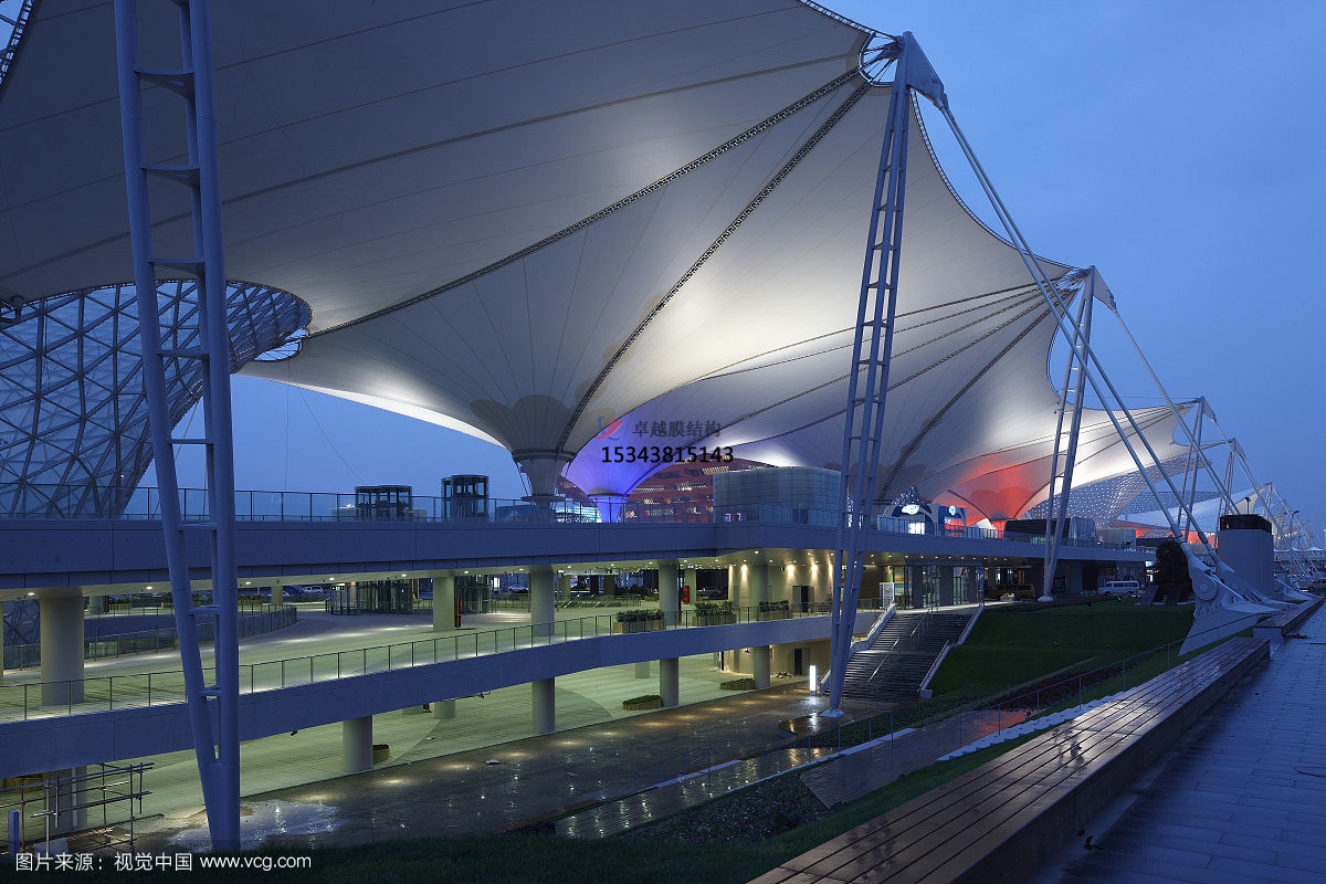 (2 )輕巧而美觀的膜結(jié)構(gòu)用于敞開(kāi)或半敞開(kāi)建筑物的遮蔽屋蓋尤為適宜。近年來(lái)在足球、田徑等比賽的體育場(chǎng)中,越來(lái)越多的看臺(tái)挑蓬都采用膜結(jié)構(gòu)。國(guó)外很多露天劇院的舞臺(tái)、博覽會(huì)的展覽館也都以膜材作為頂蓋。在我國(guó)廣大地區(qū)的農(nóng)貿(mào)市場(chǎng)也可大力推廣膜結(jié)構(gòu)。